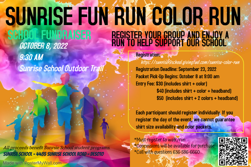 Sunrise School will be hosting their annual school fundraiser - THE FUN RUN COLOR RUN! The Sunrise Fun Run Color Run will take place Saturday, October 8, 2022 at 9:30 a.m. This will take place in the outdoor classroom. The color run will be a mile loop that families can walk/run at their pace. At 10:15 we will end the run with a 'Color Blast' party. All participants will open their color packets and release at once!